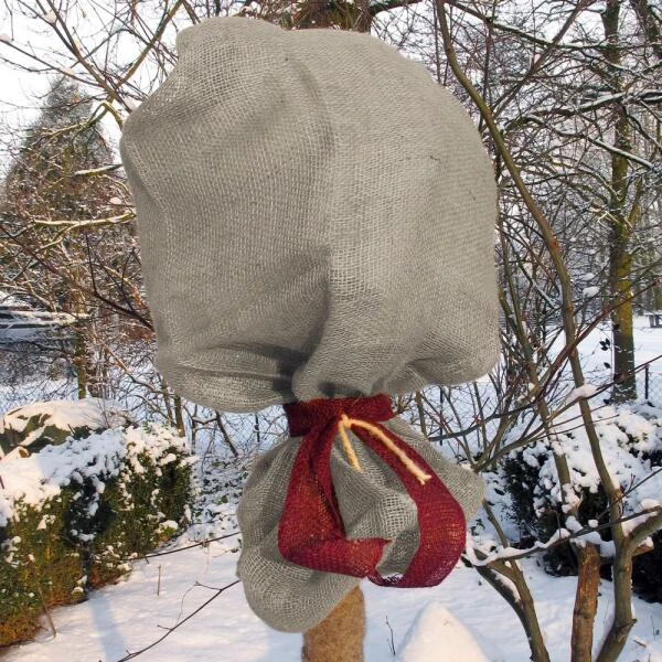 De jutezak vormt een klassieke en tegelijk tijdloze winterbescherming voor de kruin van rozen-, pot- en kuipplanten. Bladverliezende planten zijn ideaal om te bedekken met jute tijdens de wintermaanden omdat licht geen rol speelt bij hen en jute luchtdoorlatend is.