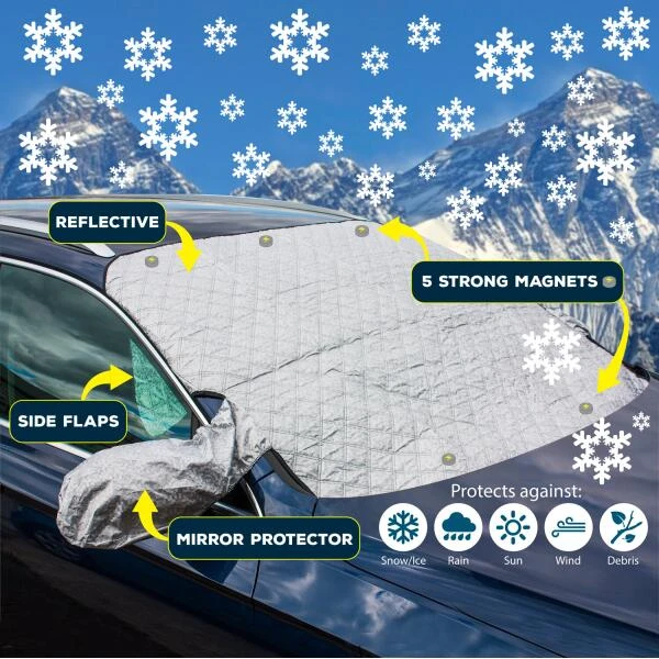 De voorruit cover is bovendien voorzien van 5 sterke magneten en spiegelbescherming. Deze twee eigenschappen, in combinatie met de zijflappen zorgen ervoor dat deze DELUXE cover mooi op zijn plaats blijft.