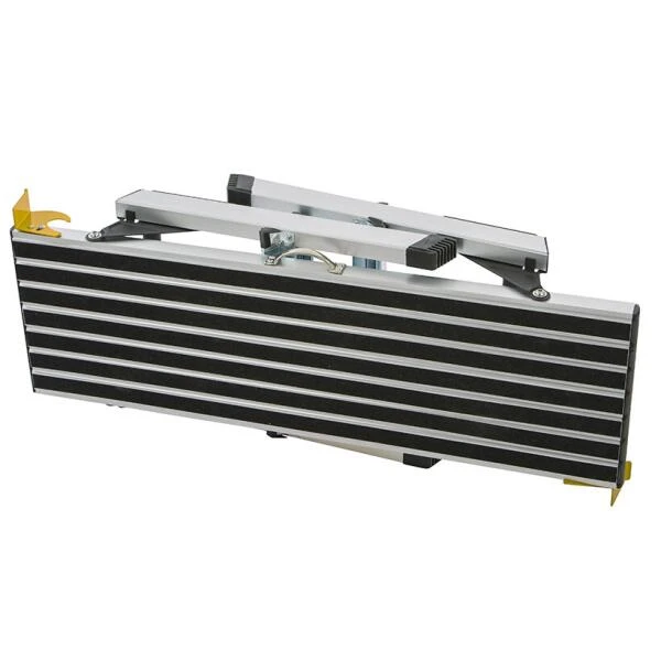 Het werkplatvorm is compact en plooibaar en voorzien van een extra veiligheidsvergrendeling.